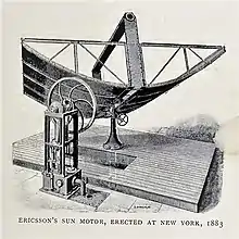 Entre 1868 et 1883, l'inventeur suédois John Ericsson fut occupé par la puissance du soleil et ses applications[8] et construisit plusieurs moteurs solaires très avancés. Cet ingénieur, qui a passé la majeure partie de sa vie à construire des moteurs à air chaud et pour lesquels il a déposé de nombreux brevets, a cherché à combiner l'air chaud et le soleil.