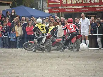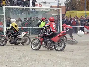 Chaque formation est composée de quatre joueurs plus un gardien qui n'est pas à moto. Le ballon pèse environ un kilogramme et mesure 40 cm de diamètre. Les matchs sont arbitrés par deux arbitres, un dans chaque camp, assistés de deux juges de lignes. Ce sport se pratique sur un terrain de football, avec les mêmes buts. La partie se déroule en quatre périodes de 20 minutes.