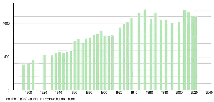 L'évolution du nombre d'habitants est connue à travers les recensements de la population effectués dans la commune depuis 1793. Pour les communes de moins de 10 000 habitants, une enquête de recensement portant sur toute la population est réalisée tous les cinq ans, les populations légales des années intermédiaires étant quant à elles estimées par interpolation ou extrapolation[18]. Pour la commune, le premier recensement exhaustif entrant dans le cadre du nouveau dispositif a été réalisé en 2007[19].