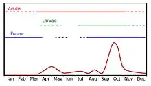 Un adulte peut vivre jusqu'à six mois, se nourrissant de jus sucrés, de nectars, de rosée, de miellats de cochenilles ou de jus de décomposition de fruits et de fumiers (déjections d'oiseaux ou autres animaux). L'adulte est inhibé par les températures trop basses (moins de 25 °C). Sous toutes ses formes (œuf, larve, asticot ou imago) la mouche est tuée à 0 °C ou par les fortes chaleurs (supérieures à 42 °C). L'adulte a besoin d'ombre pour s'abriter. Jusqu'à cinq générations peuvent se succéder entre juin et octobre voire novembre (une génération = un « vol »).