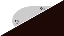 Une conséquence de ce phénomène est l'accrochage d'une goutte sur un plan incliné (voir figure ci-contre). Lorsqu'une goutte est soumise à la gravité, elle commence par se déformer jusqu'à ce que l'angle à l'avant de la goutte soit égal à l'angle d'avancée et l'angle à l'arrière égal à l'angle de reculée. Ensuite, seulement elle ruisselle.