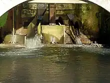 À l'arrière du moulin, l'eau regagne le cours d'eau d'origine en empruntant un autre bief, appelé canal de fuite. La rivière qui apporte l'eau au Moulin de Poyaller est la Gouaougue, sous-affluent de l'Adour.