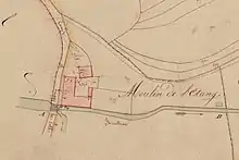 Le cadastre de 1833, permet d'attester que le moulin est toujours présent et il est appelé "Moulin de l'étang". Comme pour le moulin des Marats, il existe trois bâtiments dont le principal abrite le mécanisme.