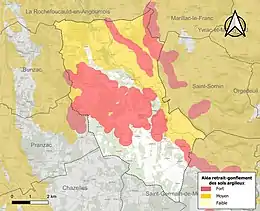 Par ailleurs la commune fait partie de l'aire d'attraction d'Angoulême, dont elle est une commune de la couronne[Note 2]. Cette aire, qui regroupe 95 communes, est catégorisée dans les aires de 50 000 à moins de 200 000 habitants[6],[7].