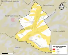 La commune est vulnérable au risque de mouvements de terrains constitué principalement du retrait-gonflement des sols argileux[15]. Cet aléa est susceptible d'engendrer des dommages importants aux bâtiments en cas d’alternance de périodes de sécheresse et de pluie. 56,3 % de la superficie communale est en aléa moyen ou fort (90 % au niveau départemental et 48,5 % au niveau national). Sur les 356 bâtiments dénombrés sur la commune en 2019, 120 sont en aléa moyen ou fort, soit 34 %, à comparer aux 83 % au niveau départemental et 54 % au niveau national. Une cartographie de l'exposition du territoire national au retrait gonflement des sols argileux est disponible sur le site du BRGM[16],[Carte 2].