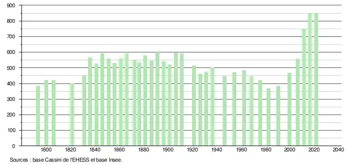 L'évolution du nombre d'habitants est connue à travers les recensements de la population effectués dans la commune depuis 1793. Pour les communes de moins de 10 000 habitants, une enquête de recensement portant sur toute la population est réalisée tous les cinq ans, les populations légales des années intermédiaires étant quant à elles estimées par interpolation ou extrapolation[21]. Pour la commune, le premier recensement exhaustif entrant dans le cadre du nouveau dispositif a été réalisé en 2006[22].