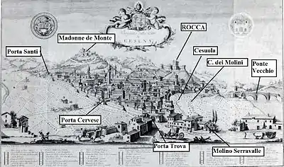 Le canal qui alimentait les différents moulins, arrivait vers la cité de Cesena à la porta dei Molini, passait sous le pont Saffi (devant la porta Fiume), longeait une partie des murs[2] pour terminer sa course dans le torrent Cesuola aux pieds du moulin de Serravalle.