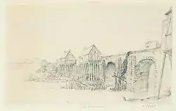 Le pont au XIXe siècle supportant le dernier moulin. | ||||