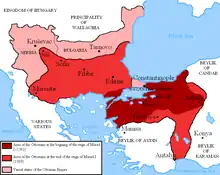 Dès 1360 les Ottomans entrèrent en Thrace par Gallipoli et prirent Andrinople (Edirne) au cours de l'année 1365, encerclant les restes de l'empire byzantin.