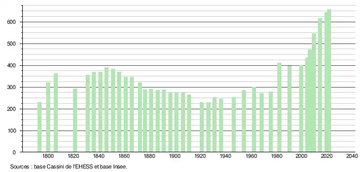 L'évolution du nombre d'habitants est connue à travers les recensements de la population effectués dans la commune depuis 1793. Pour les communes de moins de 10 000 habitants, une enquête de recensement portant sur toute la population est réalisée tous les cinq ans, les populations légales des années intermédiaires étant quant à elles estimées par interpolation ou extrapolation[19]. Pour la commune, le premier recensement exhaustif entrant dans le cadre du nouveau dispositif a été réalisé en 2004[20].