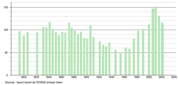 L'évolution du nombre d'habitants est connue à travers les recensements de la population effectués dans la commune depuis 1793. Pour les communes de moins de 10 000 habitants, une enquête de recensement portant sur toute la population est réalisée tous les cinq ans, les populations légales des années intermédiaires étant quant à elles estimées par interpolation ou extrapolation[30]. Pour la commune, le premier recensement exhaustif entrant dans le cadre du nouveau dispositif a été réalisé en 2005[31].
