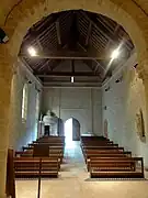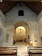 Ses deux croisillons sont munis de petites absidioles. Le voûtement fait appel aux trois principales techniques qui ont cours à l'époque romane : la voûte d'arêtes pour la croisée du transept ; la voûte en berceau pour les croisillons et les absidioles ; et la voûte en cul-de-four pour l'abside.