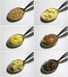 En France, le condiment connu sous le nom de moutarde est constitué des graines (en particulier de moutarde blanche), souvent réduites en farine et mélangées à du verjus. D'autres ingrédients peuvent être ajoutés, par exemple du sucre, du miel, du vin, du vinaigre ou du lait. La liste des ingrédients autorisés en France pour les moutardes figure dans le décret 2000-658[2]. Les graines entières peuvent être submergées de liquide avant le meulage si l'on veut fabriquer de la moutarde en grain dite à l'ancienne.