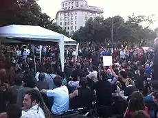 Le , 400 indignés occupant la place de Catalogne à Barcelone sont violemment expulsés par les Mossos d'Esquadra, à 7 heures du matin, pour des raisons officielles de nettoyage. Les équipements électroniques (caméras, ordinateurs, appareils photos) sont confisqués ; le bilan est de 40 blessés, tous chez les campeurs[53]. La violence de l’action policière, contrastant avec la non-violence des indignés, plus les thèmes de mobilisation très rassembleurs (lutte contre la corruption), provoquent la plus large manifestation des indignés à Barcelone depuis le . À minuit, les rues du centre, vides de toute circulation automobile, sont occupées par les manifestants. La police est également très discrète. La solidarité se manifeste grâce à laquelle, tout l’équipement confisqué le matin (cuisines, tentes, etc.) est remplacé le soir[54].