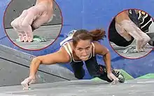 - Coincement des orteils ou du pied à l'intérieur d'une fissure ou d'un trou, créant une opposition entre plusieurs zones du chausson et du rocher. Par exemple, un crochetage talon-pointe.