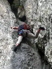 - La paume de la main vient se plaquer contre la roche, en adhérence, et souvent doigts vers le bas, afin de se pousser vers le haut.