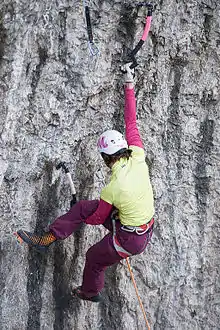 - Crochetage d'une prise ou d'une arête avec le dessus du chausson (spatule). Utilisé en dévers, pour maintenir le corps contre la paroi ou en vertical pour s'équilibrer grâce à une arête.