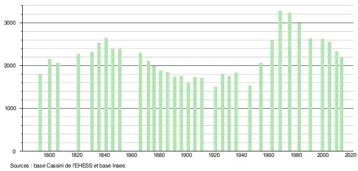 L'évolution du nombre d'habitants est connue à travers les recensements de la population effectués dans la commune depuis 1793. À partir du , les populations légales des communes sont publiées annuellement dans le cadre d'un recensement qui repose désormais sur une collecte d'information annuelle, concernant successivement tous les territoires communaux au cours d'une période de cinq ans. Pour les communes de moins de 10 000 habitants, une enquête de recensement portant sur toute la population est réalisée tous les cinq ans, les populations légales des années intermédiaires étant quant à elles estimées par interpolation ou extrapolation[13]. Pour la commune, le premier recensement exhaustif entrant dans le cadre du nouveau dispositif a été réalisé en 2004[14],[Note 1].