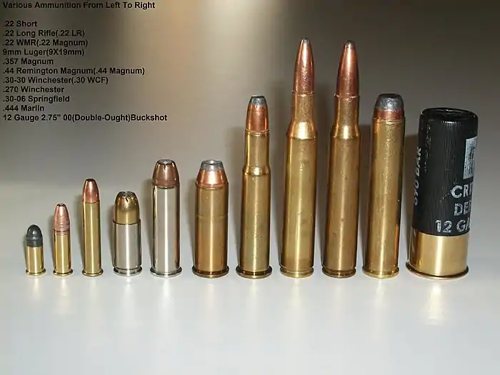 La plus importante caractéristique d'une arme à feu est la munition pour laquelle elle est chambrée. Elle détermine le calibre de l'arme. La masse de la balle (en grammes (g)) et la quantité de poudre (en grains (gr) ou en grammes (g)) déterminent la puissance de la munition et le recul de l'arme.
