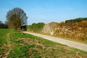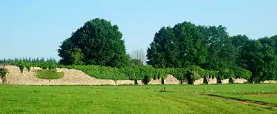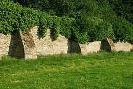 Le mur occidental est soutenu du côté intra-muros par de puissants contreforts visibles depuis les champs.