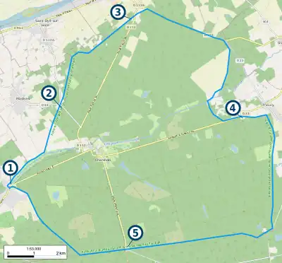 La ligne bleue figure le mur d'enceinte long de 32 km. Cinq pavillons se situent au niveau du mur d'enceinte aux entrées du Domaine national de Chambord. 1.Pavillon de la Chaussée Le comte. 2.Pavillon de Saint-Dyé. 3.Pavillon de Muides. 4.Pavillon de Thoury. 5.Pavillon de Bracieux.