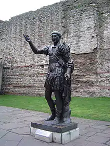 La statue de l'empereur romain Trajan, située devant le mur, est une création moderne. De plus, elle est anachronique, vu que cet empereur régna de 98 à 117 après Jésus Christ, alors que le mur date d'une période de construction qui s'étale de 190 à 225 après Jésus Christ. De plus, Trajan ne séjourna jamais en Bretagne, mais surtout au Moyen-Orient, en Égypte, et en Gaule. Le mur fut certainement construit sous le règne de Septime Sévère, entre 193 et 211, qui séjourna régulièrement à Londinium et York, avec ses fils Caracalla et Geta.