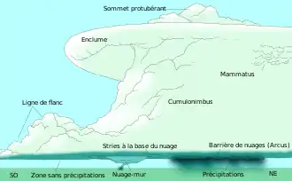 Au contraire, le mur de nuages se retrouve plutôt vers l'arrière du cumulonimbus, dans de l'air ascendant et sans précipitations. L'air ambiant se dirige vers ce mur.