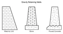 - Le mur-poids, qui peut-être en pierres sèches, pierres jointoyées, en béton, en gabion ou en éléments empilés de béton préfabriqué,
