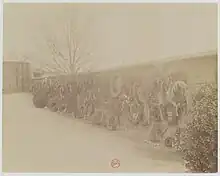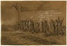 Le samedi , seul le quartier de Belleville résiste encore ; les canons communards tirent leurs dernières munitions depuis les hauteurs des Buttes-Chaumont et du Père-Lachaise, où les combats se poursuivent au corps-à-corps jusqu'entre les tombes[1]. Vers la fin de l'après-midi, les versaillais sont maitres du cimetière[2]. Ils fusillent les 147 fédérés survivants le dos au mur d’enceinte et jettent leurs corps dans une fosse commune creusée à son pied[3]. Au cours des heures et des jours qui suivent, des centaines d'autres cadavres[4], fédérés pris plus loin et fusillés là[5] ou exécutés ailleurs et amenés à pleines charretées, sont enfouis aux côtés des premiers, entassés sur trois rangs de hauteur[6]. Dans les rues avoisinantes, le dernier coup de feu est tiré le dimanche à 14 heures, marquant la défaite de la Commune et le début de la répression officielle[5].