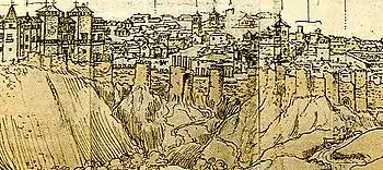 En dehors de l'enceinte fortifiée, ils existaient différents terrains publics consacrés au loisir et aux jeux équestres (almusara) ainsi qu'un quartier arabe ou medina et un quartier chrétien ou mozarabe.