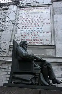 Toujours à Saint-Pétersbourg, Mendeleïev est aussi honoré par une statue et un tableau périodique géant sur Moskovskiy Prospekt, à proximité de l'Institut de Technologie où il obtint son premier poste d'enseignement en 1864, et devant le bureau des poids et mesures dont il fut directeur.