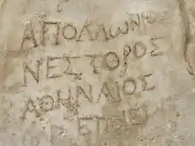- Ἀπολλώνιος // Νέστορος // Ἀθηναῖος // ἐποίει (« œuvre d'Apollonios, fils de Nestor, d'Athènes ») ; Inscriptiones Græcæ, 1234 = Marion Muller-Dufeu, La Sculpture grecque. Sources littéraires et épigraphiques, Paris, éditions de l'École nationale supérieure des Beaux-Arts, coll. « Beaux-Arts histoire », (ISBN 2-84056-087-9), no 2809.