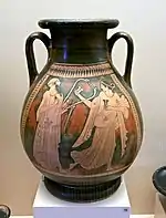 Pélikè attique à figures rouges, provenant de la tombe d'un enfant, représentant un homme avec une lyre et une femme avec des claquettes ou des castagnettes. |