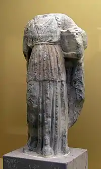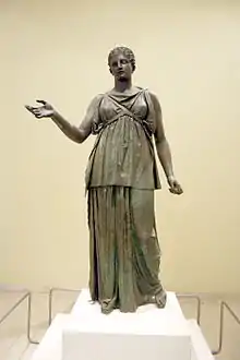 La déesse porte un péplos, robe faite d'une seule pièce de tissu non coupé qui s'enroule autour du corps et retombe en formant des plis. Les lanières des sandales, coulées séparément, ont disparu.