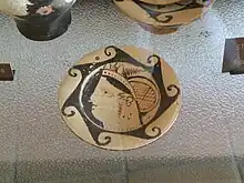 Kylix attique à figures rouges : Cette coupe de grand diamètre (34 cm) est présentée à l'envers. Il représente une scène palestre : des athlètes tiennent des javelots sont représentés en nudité héroïque et prenant des poses cambrées. Sous les anses se développe un riche décor de palmettes finement travaillées.