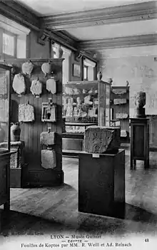 Émile Guimet enrichit le musée d'objets égyptiens à un rythme soutenu, intégrant ainsi dans les collections 250 pièces en six ans. Les personnes qui lui fournissent des pièces sont Eugène Allemand, M. Yvan, Joseph Durighello, le comte Alexandre Maximos de Zogheb et quelques autres antiquaires de Paris, ou d'autres villes qu'il visite[5].