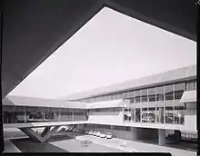 Le bâtiment, dans le projet original de 1960 est caractérisé par une imposante façade en longueur, convexe et revêtue de pierre, qui donne l'impression d'être suspendue au-dessus d'un vitrage.