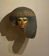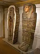 Le mobilier égyptologique comporte également un masque funéraire, vestige d'un sarcophage, daté de la XXe dynastie et mesurant 28,5 × 26,5 cm[101] ; le sarcophage d'un personnage nommé Idi (de) — un officier de marine d'Assiout également appelé Jdjj —, pièce datée de la XXe dynastie, mesurant 200 × 48 × 52 cm et dont le couvercle est orné d'un nocturlabe[102],[103],[104] ; le fragment d'une « baguette » apotropaïque (baguette de naissance), un objet fabriqué dans de la corne d'éléphant portant des inscriptions sur chaque côté et qui mesure 11 cm de long pour 5,8 cm de diamètre[105] ; une figurine représentant un babouin tenant un Œil oudjat, conçue en faïence et mesurant 4,5 cm de haut[106] ; un sarcophage confectionné en bois polis dont les dimensions externes et internes sont respectivement de 195 × 70 × 47 cm et 175 × 50 × 30 cm, pièce attribuable à la fin de la XXVe/début de la XXVIe dynastie — sur la surface externe du cercueil figure un texte évoquant le jugement de l'âme et au sein duquel les divinités Thot, Rê-Horakhty, Osiris, Isis, Nephtys et Anubis sont mentionnées —[107],[108] ; un siège en bois daté du Nouvel Empire et mesurant 21 cm de haut pour 34 cm de long et 24 cm de large[109] ; la statue d'un faucon faite en bronze dont la tète est surmontée d'une double couronne pharaonique, une pièce datée entre 664 et 332 ans av. J.-C. mesurant 7,3 × 5,7 × 0,8 cm pour une hauteur de 23,5 cm[110],[111] ; une stèle consacrée au dieu Henou mesurant 5 × 26 × 41cm[112],[113] ; et la statue d'un ibis, une sculpture confectionnée en bronze, de 6 cm de haut pour 9 cm de long et datée des VIIe – IVe siècle av. J.-C.[114],[115].