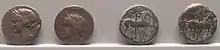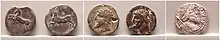 Au revers se trouve un cheval bien redressé ou tournant la tête en arrière, avec un palmier ou un uræus. Ultérieurement, à l'époque des Barcides, les pièces portent des effigies imberbes ou barbus, diadèmées ou laurées ; la proue d'un navire ou un éléphant se trouvent au revers. Durant la guerre des Mercenaires. les révoltés ont émis leur propre monnayage, avec à l'avers, l'effigie d'Héraclès-Melkart couvert d'une peau de lion symbole de victoire et, au revers, un lion au-dessous duquel est inscrit le nom grec des Libyens ΛΙΒΥΩΝ.