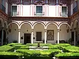 La façade du bâtiment est un exemple de cette fusion. De composition rigide, l’ordonnancement est allégé par les éléments décoratifs typiques du baroque sévillan, dont certains furent ajoutés postérieurement à l’édification de la façade. Les fenêtres, encadrées par des pilastres, sont surmontées de festons. Le portail, qui fut plaqué dans les années 1940 après avoir été détaché d’une autre partie de l’édifice, est nettement marqué par le goût baroque : colonnes torses, fronton brisé, statuaire...