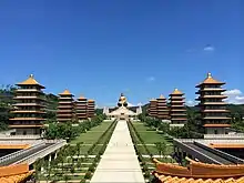 C’est un ensemble de tours de style chinois de huit niveaux dressées face à face le long de la place nommée « Le chemin de l’éveil », portant chacune un nom spécifique, et l’ensemble de ces huit appellations révèle le profil complet de la pratique bouddhiste.