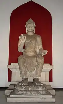 Bouddha assis sous le nāga Muchalinada de style Dvaravati (Wat Pradu Song Tham, Phra Nakhon Si Ayutthaya), pierre, VIIIe – Xe siècle