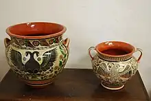 La poterie bandera, qui signifie drapeau en espagnol, est ainsi nommée parce qu'elle a les couleurs vert, rouge et blanc du drapeau mexicain[10]. Le rouge est couramment utilisé comme couleur de fond, tandis que le vert et le blanc le sont pour les détails décoratifs[8]. Il s'agit également d'une vaisselle brunie non émaillée. Pour des raisons inconnues, ce style de poterie est très rare[12]. Un objet peu commun est appelé engretado.Il a un vernis spécial qui le rend utile pour la cuisson, le vernis agissant comme une couche de téflon qui empêche les aliments de coller lorsqu'ils sont chauffés[10].