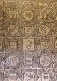 Le sol est couvert de la mosaïque de Dionysos dieu grec de la vigne , du vin, restaurée. Celle-ci ne pouvant être transportée aisément, les architectes Klaus Renner et Heinz Röcke ont dessiné le musée autour de la mosaïque, qui date de 220-230. Les allées et agencements intérieurs du musée reproduisent le plan de l'ancienne villa.