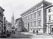 Mais à Bâle, c’est le manque récurrent de place dans la maison Haus zur Mücke qui incite à construire un nouveau bâtiment. Après la séparation du canton en deux parties, ville et campagne, la discussion sur l’emplacement de la collection publique prend une dimension politique. La loi universitaire de 1818 transforme la haute école autonome et corporative en institut de formation cantonal et le patrimoine de l’université devient propriété de l’État. Selon une décision arbitrale, deux tiers de la collection formée par les biens de l’université appartenaient à Bâle-Campagne et devaient être rachetés par Bâle-Ville. Consternée par cette décision, la ville promulgue en 1836 une loi sur l’administration et l’utilisation du patrimoine de l’université qui l’attribue définitivement au territoire de la ville de Bâle. Cette réglementation est toujours en vigueur[14].