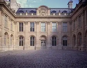 À gauche, il conçoit une façade en trompe-l'œil, dite «renard», qui masque en réalité un mur appuyé sur le tracé de l'enceinte de Philippe Auguste. Ainsi donne-t-il l'illusion d'un espace vaste et préserve-t-il une apparente symétrie. L'originalité de cette architecture tient aussi à l'ordonnance de pilastres sculptés, dits «colossaux», courant sans rupture au niveau des étages de bas en haut de la façade. Sur le même principe de continuité, les quatre façades qui encadrent la cour sont identiques, ne distinguant pas particulièrement le corps de logis principal, contrairement à l'usage. L'architecte produit ainsi un effet de verticalité imposant, un rythme soutenu qui confère une véritable majesté à l'édifice. Un passage conduit à la petite basse-cour, où remises et écuries ont une issue directe sur la rue.