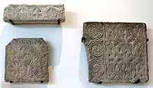 • Un linteau de 60 cm de longueur et de 34 cm de hauteur en calcaire. Il est gravé de quatre têtes de cheval avec des restes de peintures.