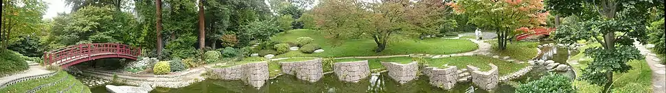 - un village japonais, créé en 1898, au retour du deuxième voyage au Japon d'Albert Kahn, par un jardinier et un charpentier-maçon venus de ce pays. De son voyage au Japon en 1897 Albert Kahn rapporte, en pièces détachées, deux maisons ainsi que les portes et un pavillon de thé remplacé en 1965 et inauguré en 1966 par la société des maîtres de thé de l'école de cérémonie du thé Urasenke, en collaboration avec la ville de Kyôto (des cérémonies du thé y sont toujours pratiquées) ;
