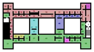 Les pièces 31 à 60, auxquelles s'ajoute la pièce 23 (ancienne salle à manger), à l’exclusion des chambres 35 et 36, des appartements 38 à 41 et des appartements 46 à 50, abritent les appartements royaux.