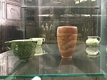 Dans la même salle se trouve également la collection de verrerie romaine, probablement la plus importante du nord de l'Italie, dans laquelle se trouvent des pièces de la plus haute qualité et rareté, comme les canthares en verre bleu foncé de Frascarolo et la coupe d'Ennion[5]. Le verre romain du musée se distingue par sa qualité et sa variété typologique. Dans la collection, attribuable dans la majorité des pièces aux Ier et IIe siècles, les techniques de traitement les plus diverses sont attestées[6].